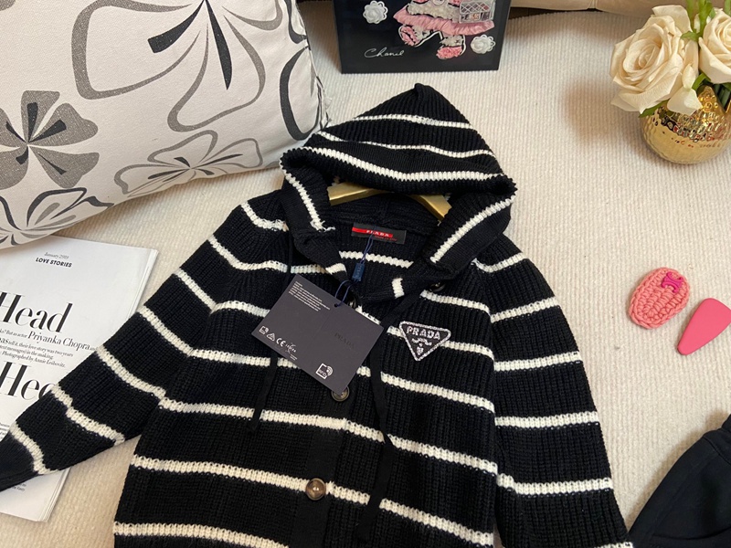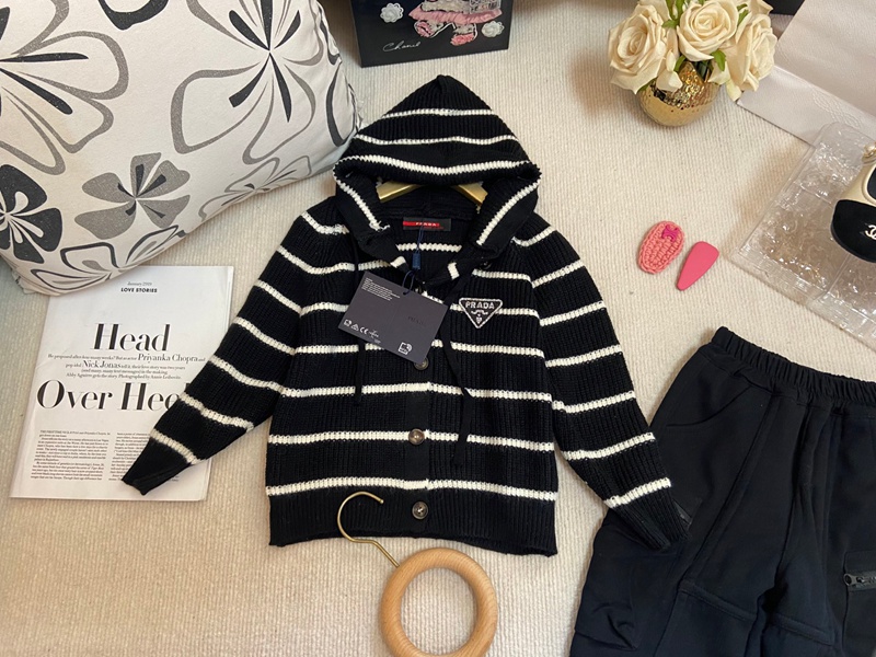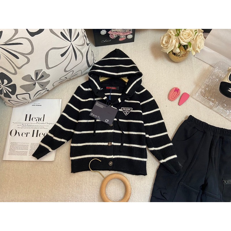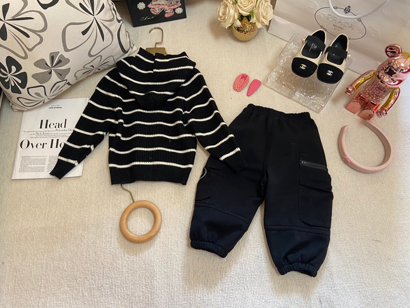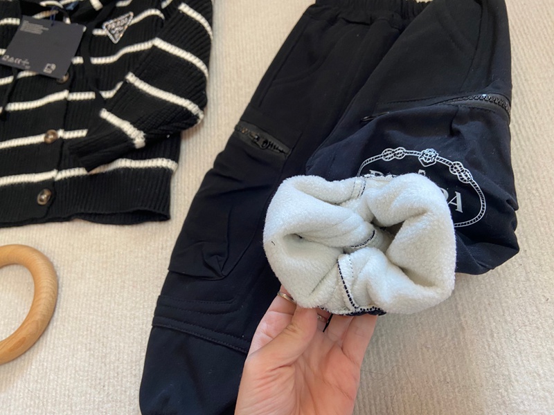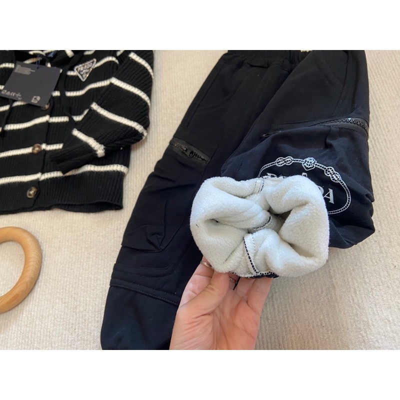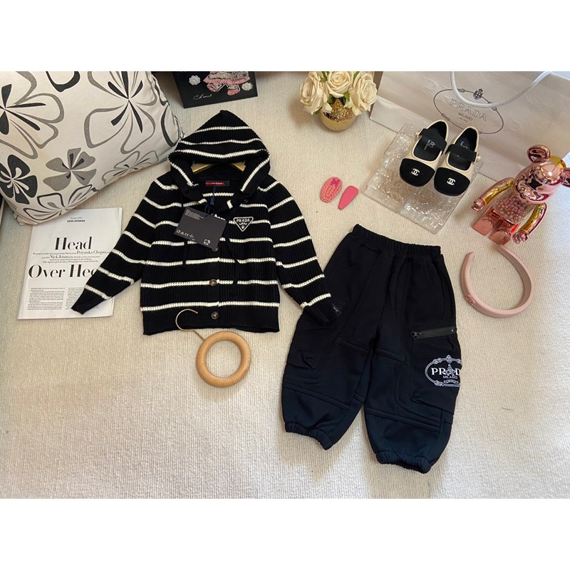 ブランド名: キッズ プラダ風ロゴ刺繍セット 黒白ストライプカーディ 機能性カーゴパンツ 通学・外出両用