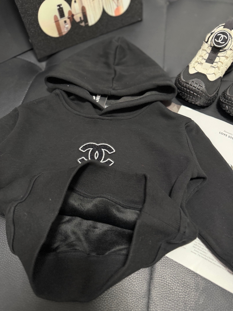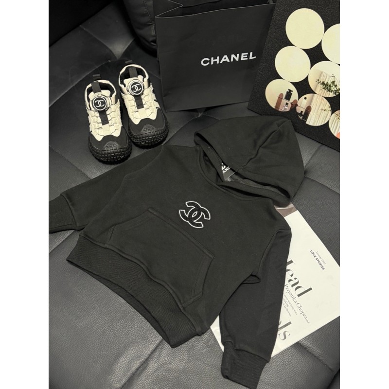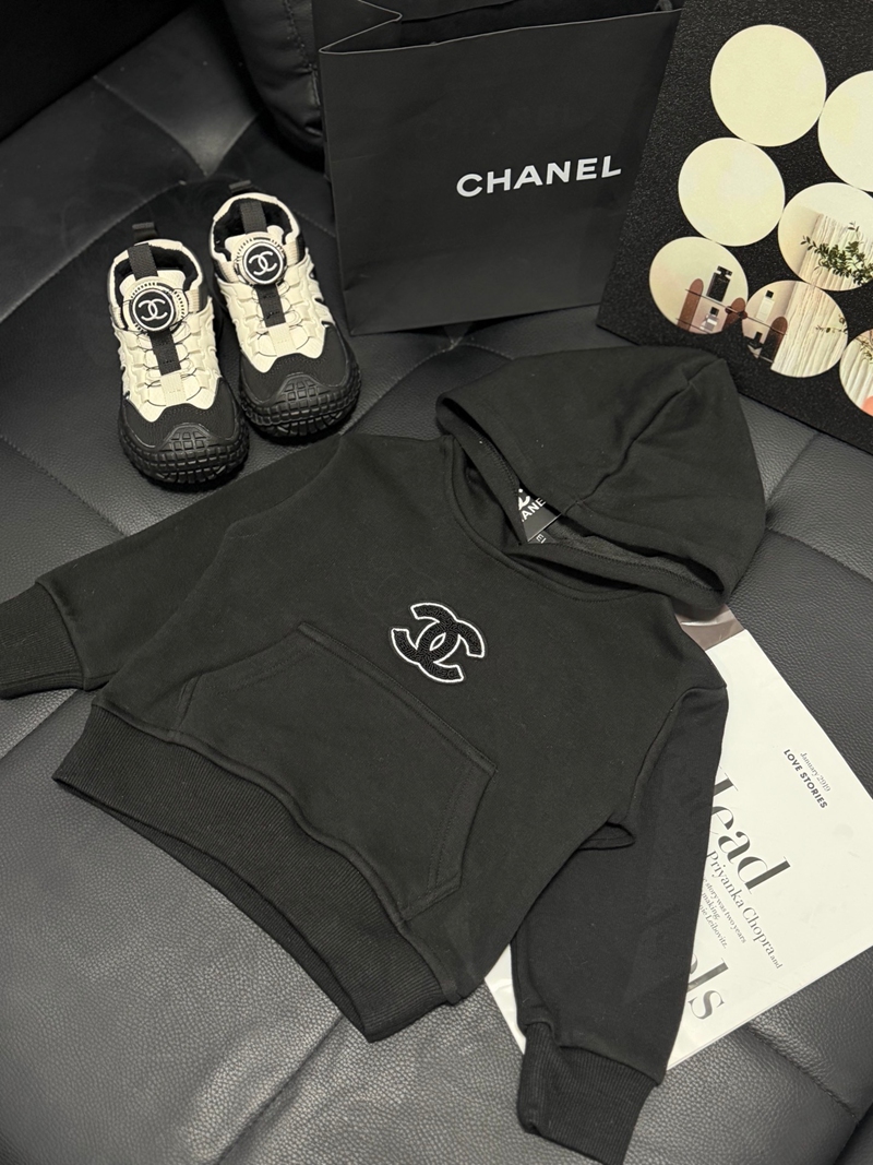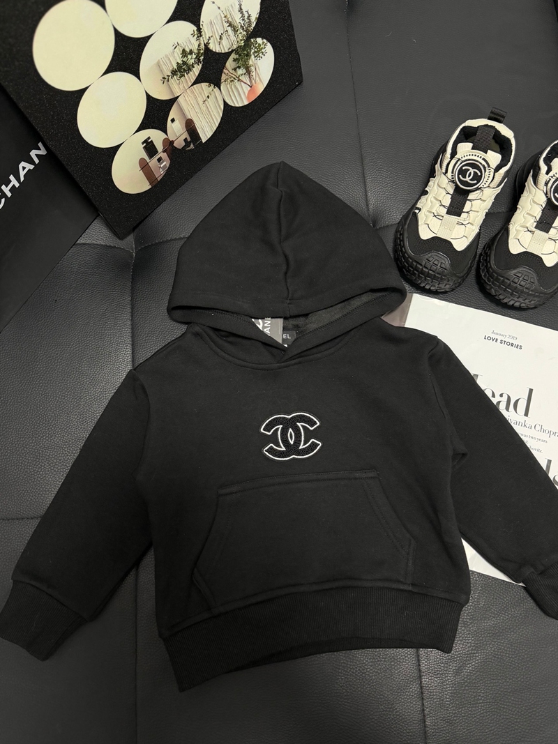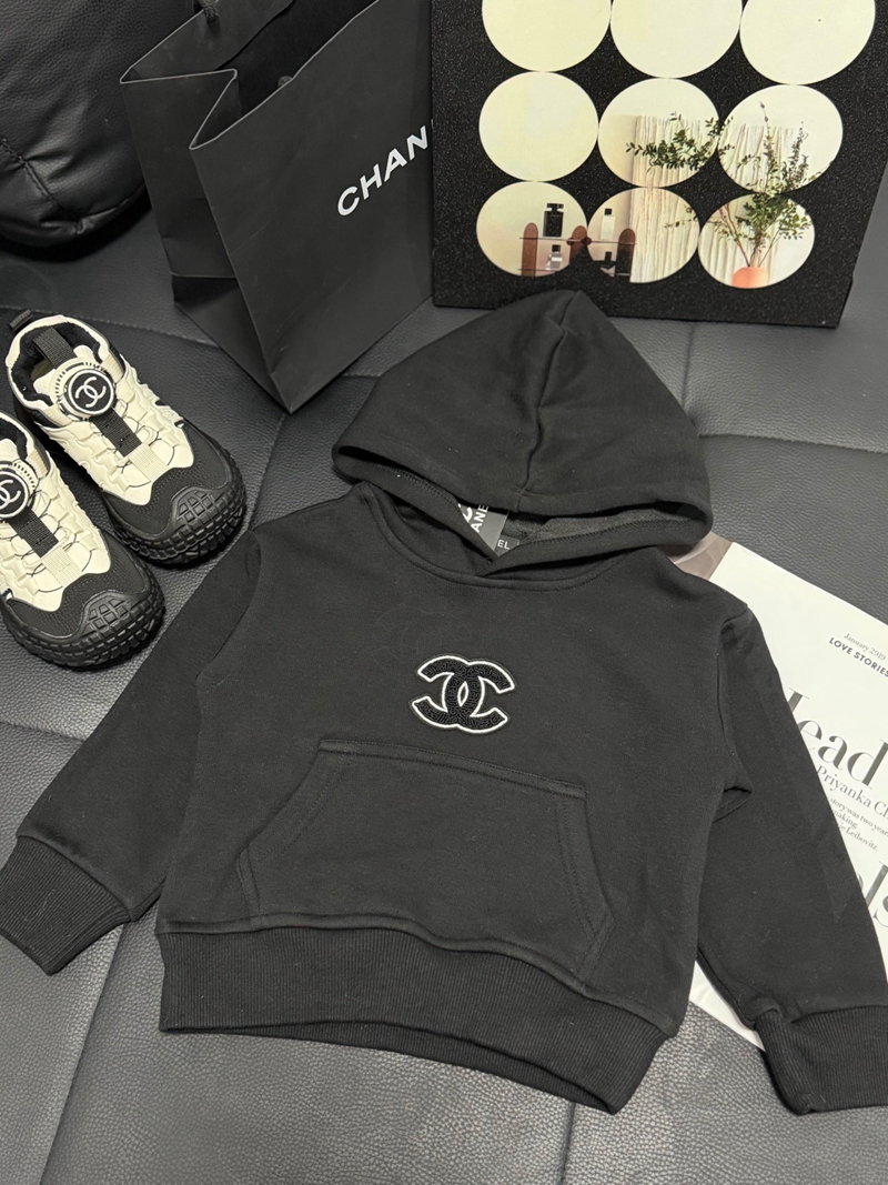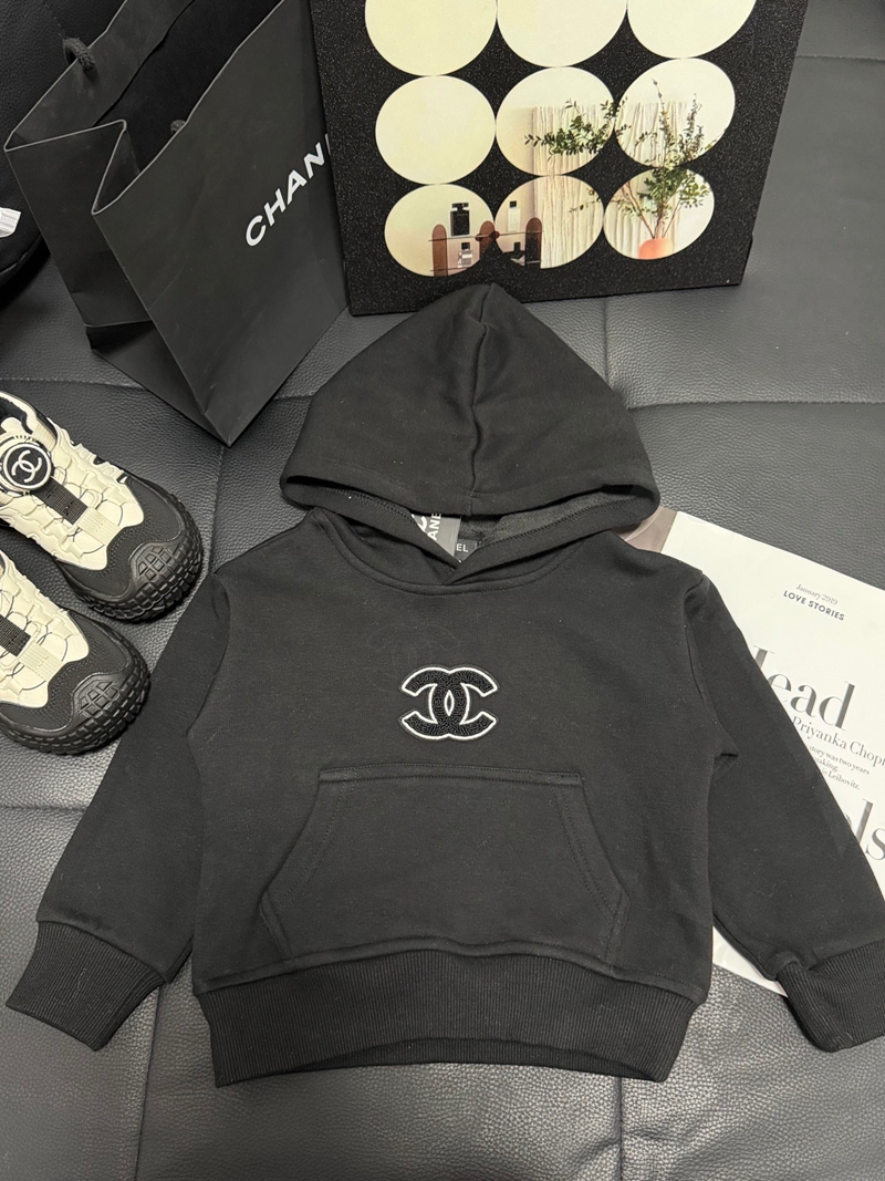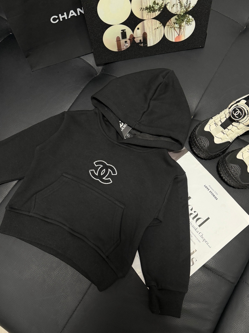 ブランド名:CHANEL子供服シャネルパーカー キッズブラックハイブランド シャネル風ジュニアブラックプルオーバーフーディー クラシックデザイン