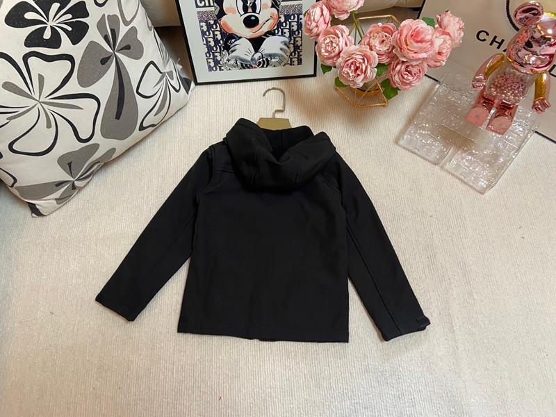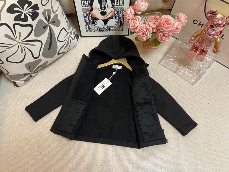シンプルだからこそデイリー使いにぴったりのシャネル風 キッズ ブラック ロゴアクセント フード付きジャ。 季節の変わり目や冷房対策など、寒い日の重ね着にもオススメ!幅広いシーンで活躍するアイテムです♪