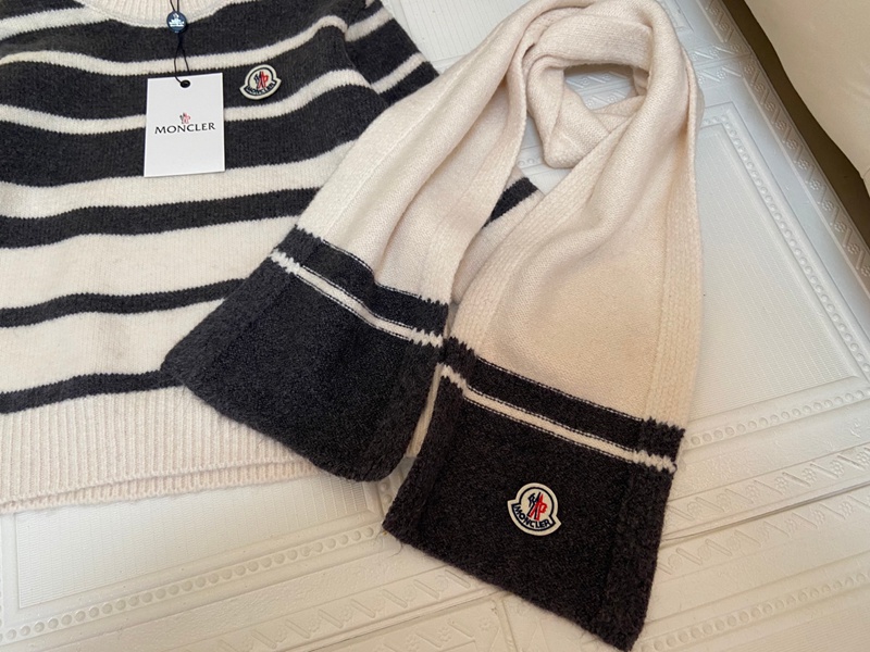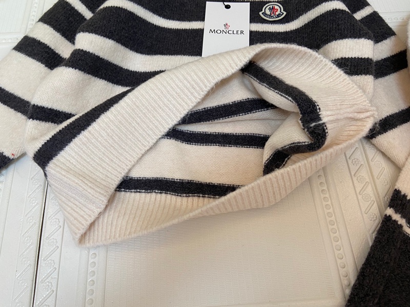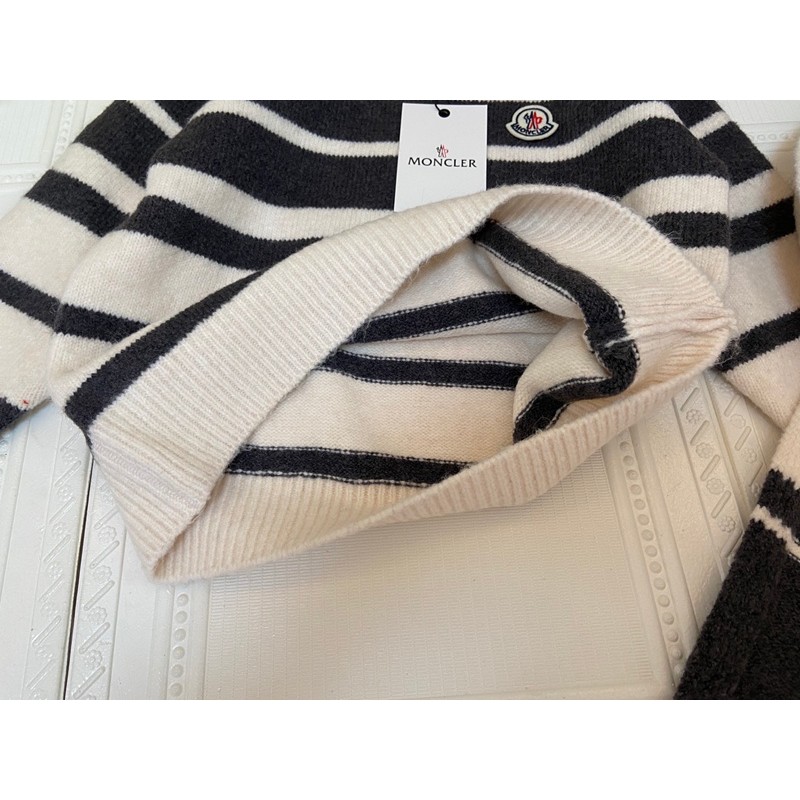 しっかり厚みがありながら、軽い着心地が魅力のMONCLERキッズ ブラック × ベージュストライプ ニット + スカーフ 2 点です。